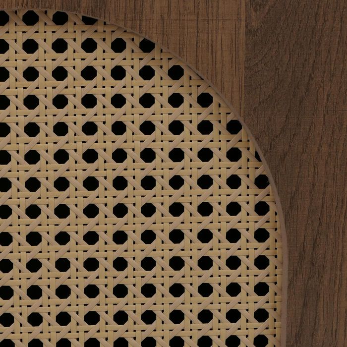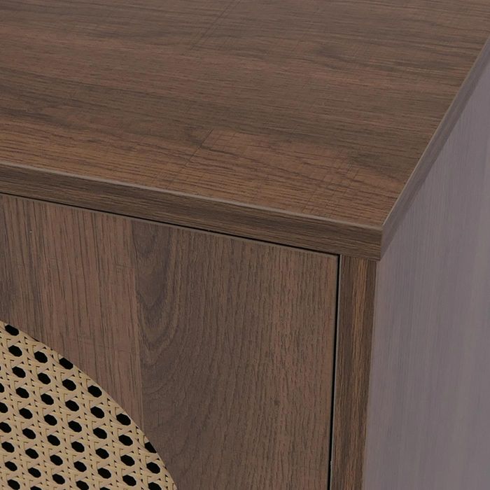 - Die Kommode kombiniert modernes Design mit hoher Funktionalität. Die kratzfeste, wasserabweisende Melamin-Oberfläche und die Türen mit dekorativem Poly-Rattan-Einsatz bieten zwei Ablagefächer für grosszügigen Stauraum im Wohnbereich.