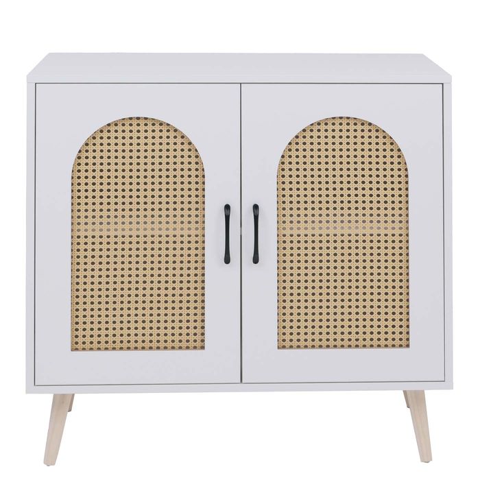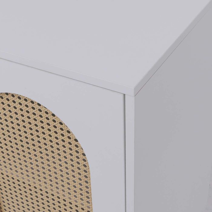 - Die Kommode kombiniert modernes Design mit hoher Funktionalität. Die kratzfeste, wasserabweisende Melamin-Oberfläche und die Türen mit dekorativem Poly-Rattan-Einsatz bieten zwei Ablagefächer für grosszügigen Stauraum im Wohnbereich.