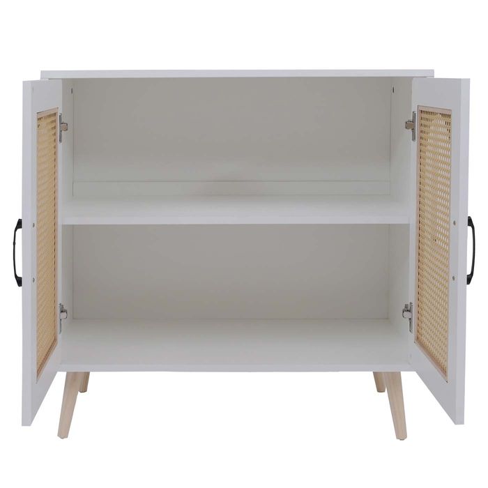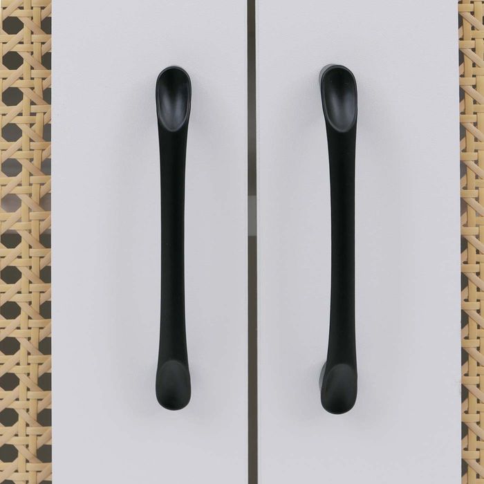 Die Kommode P51 verbindet modernes Design mit praktischer Funktionalität und schafft eine stilvolle Lösung für mehr Ordnung in Ihrem Zuhause. Die pflegeleichte Melamin-Oberfläche ist kratzfest und wasserabweisend, sodass die Anrichte auch bei täglicher Nutzung langlebig schön bleibt. Hinter den beiden Türen verbergen sich grosszügige Ablagefächer, die reichlich Platz für Geschirr, Bücher, Akten oder Wohnaccessoires bieten und für eine aufgeräumte Atmosphäre sorgen. Besonders ansprechend wirken die Türfronten mit dekorativem Poly-Rattan-Einsatz, die dem Schrank eine natürliche und zugleich moderne Note verleihen. Passend dazu ergänzen hochwertige Holzgriffe in warmer Naturfarbe den harmonischen Gesamteindruck und machen das Möbelstück zu einem Blickfang in jeder Einrichtung.