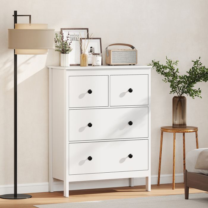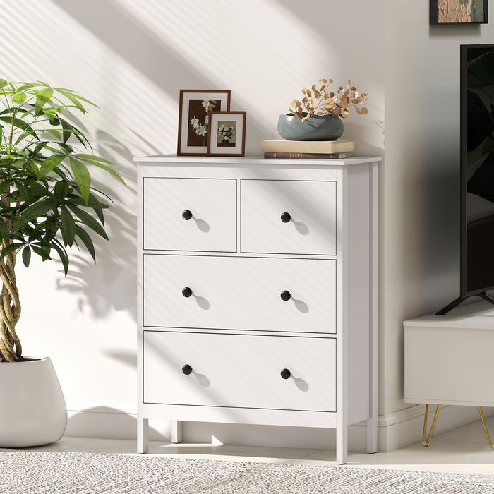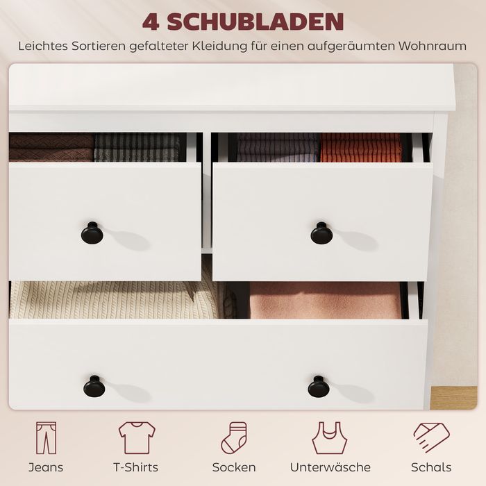 Mit den Schubladen dieser Kommode – zwei kleinen und zwei grossen – bleiben Kleidung, Bettwäsche und Alltagsgegenstände sortiert und verstaut. Ihr reines weisses Design mit schwarzen, runden Griffen sorgt für modernen Charme und passt nahtlos in jedes Schlafzimmer oder Flur. Der HOMCOM 4-Schubladen-Schubladenschrank bringt Frische und Ordnung in Ihr Zuhause.
