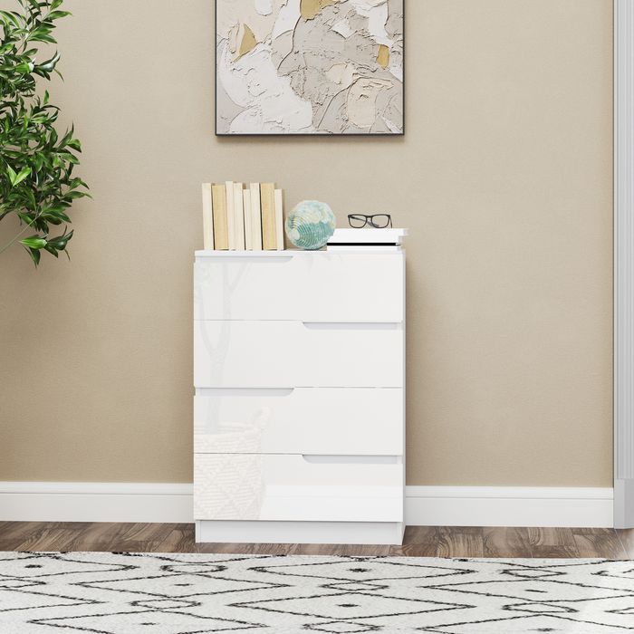 Verwandeln Sie Ihr Schlafzimmer mit der stilvollen Kommode. Diese weisse Kommode bietet dreiteilige Stahlschienen für ein sanftes Öffnen und Schliessen sowie gebogene, versteckte Griffe, die ihr ein modernes Aussehen verleihen. Sie enthält vier grosse Schubladen, die jeweils bis zu 24 T-Shirts oder 6 Jeans aufnehmen können. Die pflegeleichte Melaminoberfläche sichert anhaltende Schönheit mit wenig Aufwand.