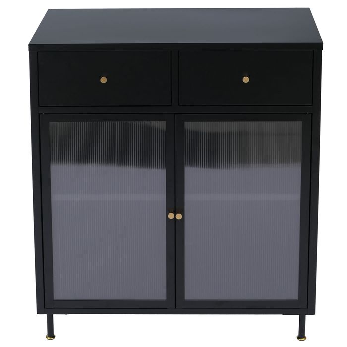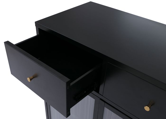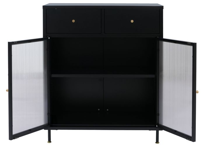 - Die Kommode O87 verbindet einen schlichten Industrial Look mit halbtransparenten Schilfglastüren für eine moderne, stilvolle Optik. Zwei Schubladen und grosszügiger Stauraum mit Fachboden bieten praktische Ordnungsmöglichkeiten.