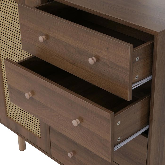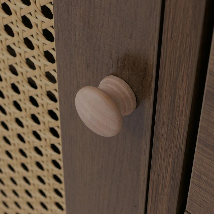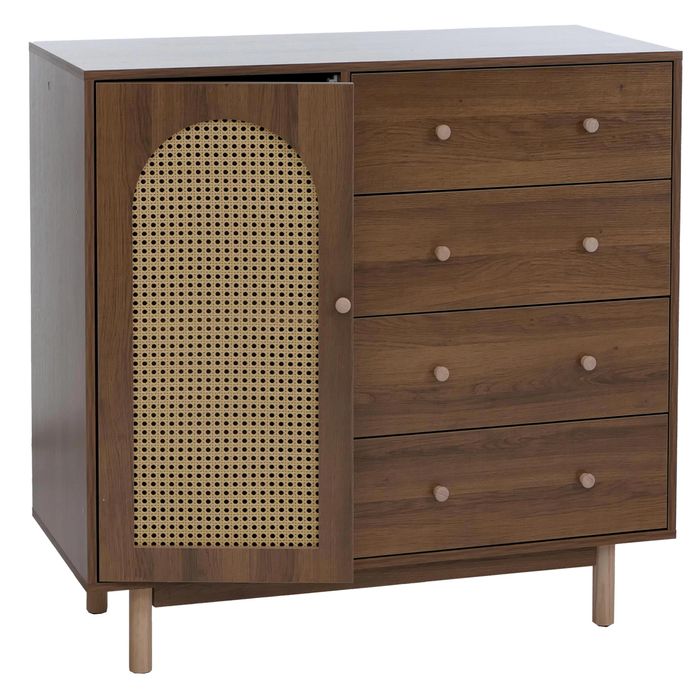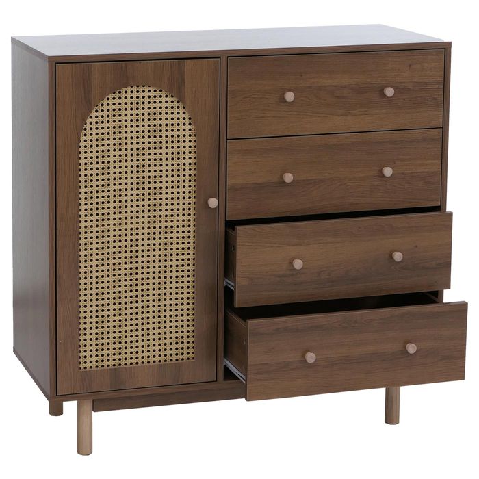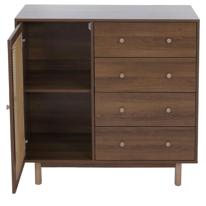 - Ein besonderes Highlight ist die Türfront mit dekorativem Poly-Rattan-Einsatz, die eine warme, natürliche Ausstrahlung verleiht. Vier geräumige Schubladen bieten viel Platz für Accessoires oder Haushaltsutensilien und sorgen für Ordnung mit System.