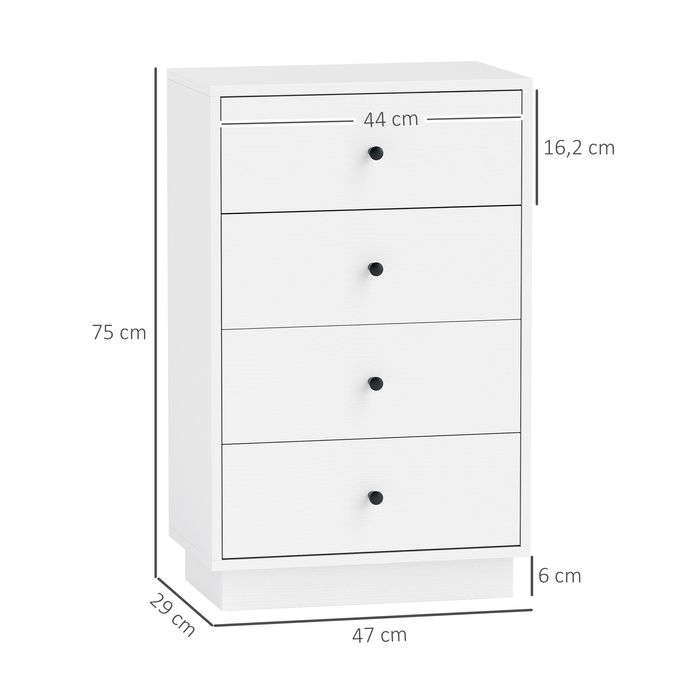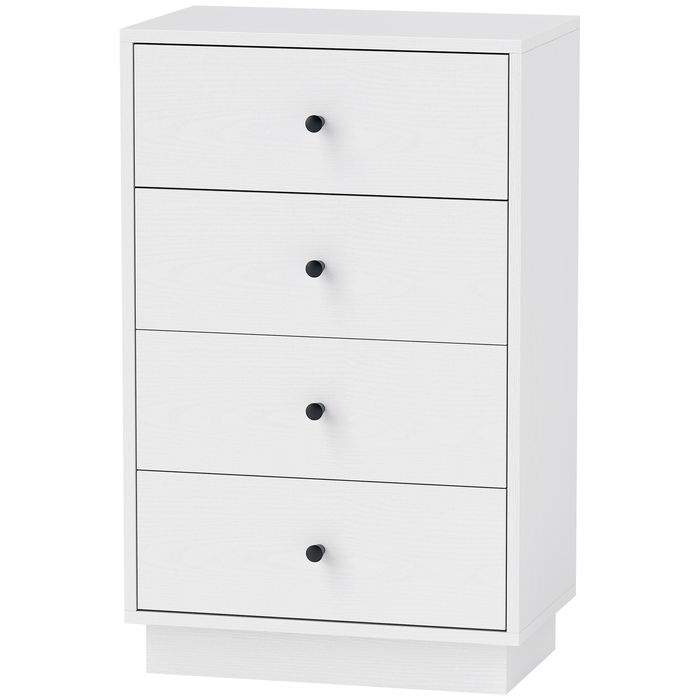 Bringen Sie mit der HOMCOM Kommode mit 4 Schubladen Ordnung mit Stil. Die schicke Kommode bietet vier grosse Fächer für alles, von Leggings bis zu täglichen Essentials. Perfekter Aufbewahrungsschrank für jeden Raum, garantiert ihre robuste Bauweise Stabilität und das elegante, weisse Design mit schwarzen Griffen verleiht Ihrem Raum moderne Eleganz.