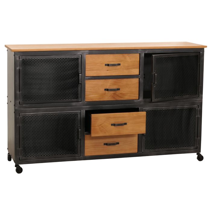Entdecken Sie das vielseitige Sideboard im Retro-Design, das nicht nur durch seine Ästhetik, sondern auch durch seine funktionalen Eigenschaften überzeugt. Ausgestattet mit vier geräumigen Staufächern und vier praktischen Schubladen, bietet dieses Sideboard grosszügigen Stauraum für all Ihre Bedürfnisse. Die Türoberfläche im ansprechenden Gitter-Design verleiht Ihrem Raum eine stilvolle Note und sorgt gleichzeitig für eine optimale Belüftung des Inhalts. Dank der robusten Konstruktion ist die Anrichte besonders langlebig und widerstandsfähig. Die integrierten Rollen ermöglichen ein müheloses Verschieben, wobei die hinteren beiden Rollen feststellbar sind, um einen sicheren Stand zu gewährleisten. Dies macht das Sideboard nicht nur flexibel in der Handhabung, sondern auch stabil im Gebrauch.