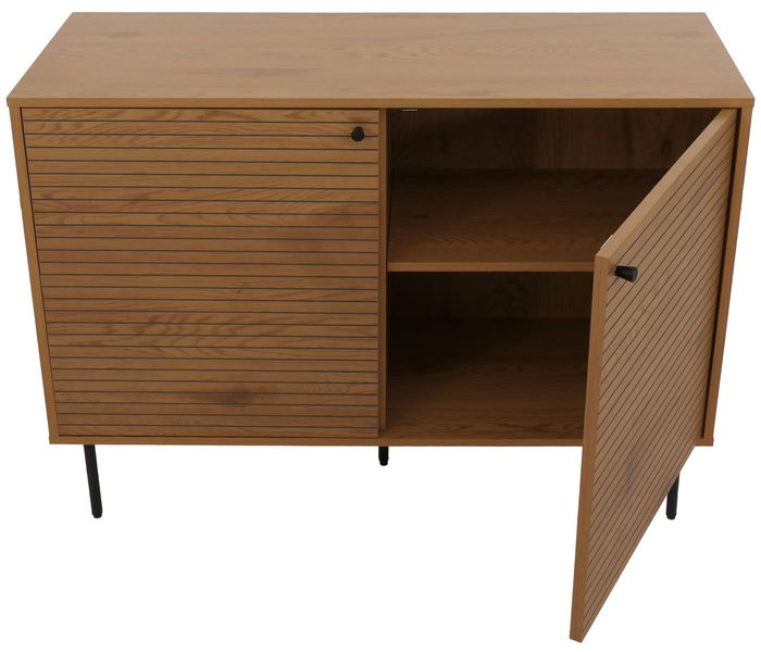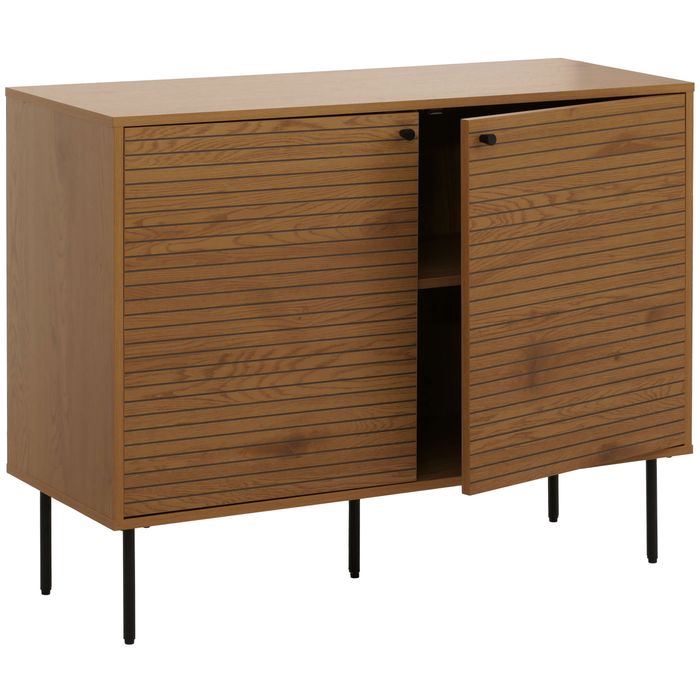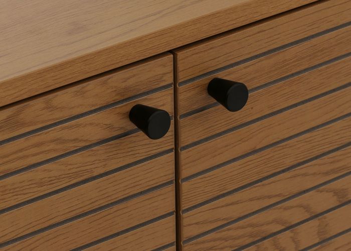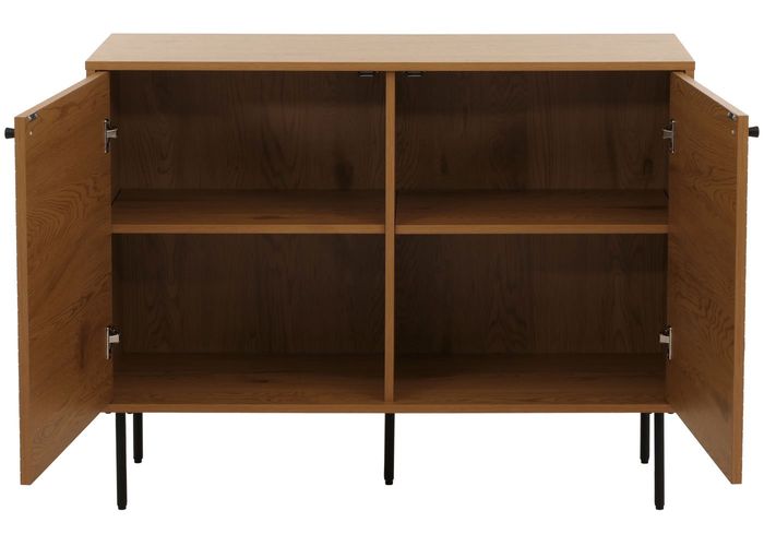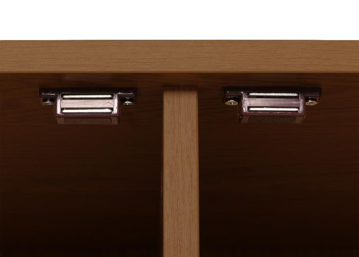 - Die Kommode überzeugt mit vier grosszügigen Ablagefächern und Türen im skandinavischen Stil mit dekorativen Griffen. Magnetverschlüsse sorgen für sanftes Schliessen, während höhenverstellbare Fussbodenschoner Stabilität bieten und Böden schonen.