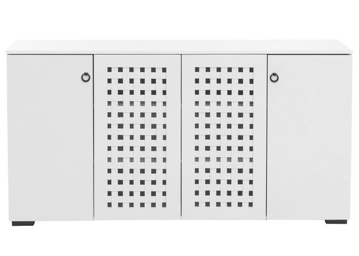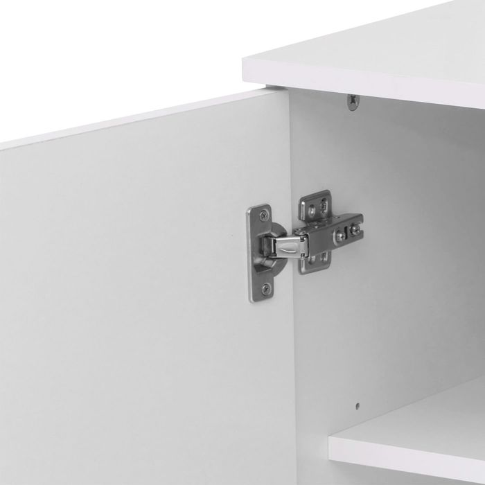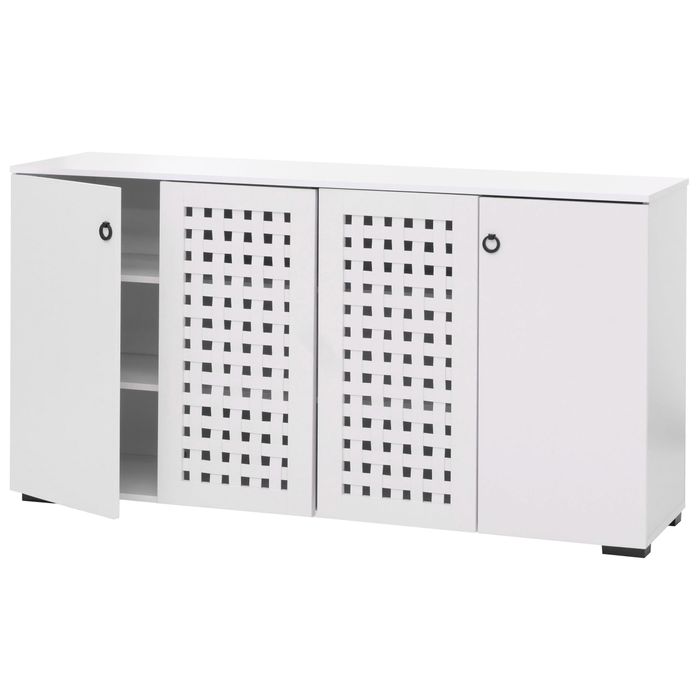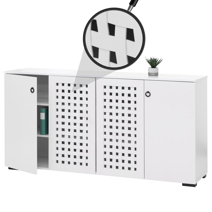 - Das Sideboard N87 bietet mit 4 Türen und 9 Ablagefächern grosszügigen Stauraum. Flexible Regalböden, robuste Materialien mit laminiertem Papier und PVC-Kanten sowie elegante runde Türgriffe machen es funktional, langlebig und pflegeleicht.