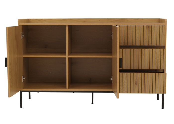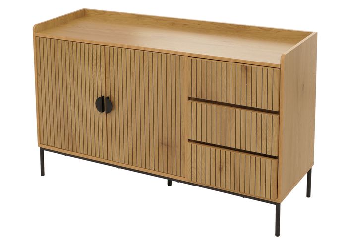 Das Sideboard O39 vereint modernes Design mit praktischer Funktionalität und setzt stilvolle Akzente in jedem Wohnraum. Die strukturierte Front verleiht der Kommode eine elegante und zugleich markante Optik, die sich mühelos in unterschiedliche Einrichtungsstile integrieren lässt. Drei geräumige Schubladen und zwei Türen bieten grosszügigen Stauraum für alles, was ordentlich verstaut, aber dennoch griffbereit sein soll – ob Geschirr im Essbereich, Unterlagen im Büro oder Accessoires im Flur. Dank des praktischen "Tip to open"-Mechanismus lässt sich das Sideboard ganz ohne Griffe öffnen, was nicht nur besonders modern wirkt, sondern auch die klare Linienführung des Möbels unterstreicht.