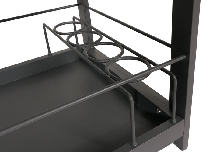 - Der Servierwagen mit Rollen und Griff verleiht Ihnen noch mehr Flexibilität. Er bietet Platz auf 3 Etagen und hat einen Getränkehalter für 4 Flaschen. Zusätzlich bietet die Gartenküche viel Ablagefläche und ein Schrankelement für Utensilien.