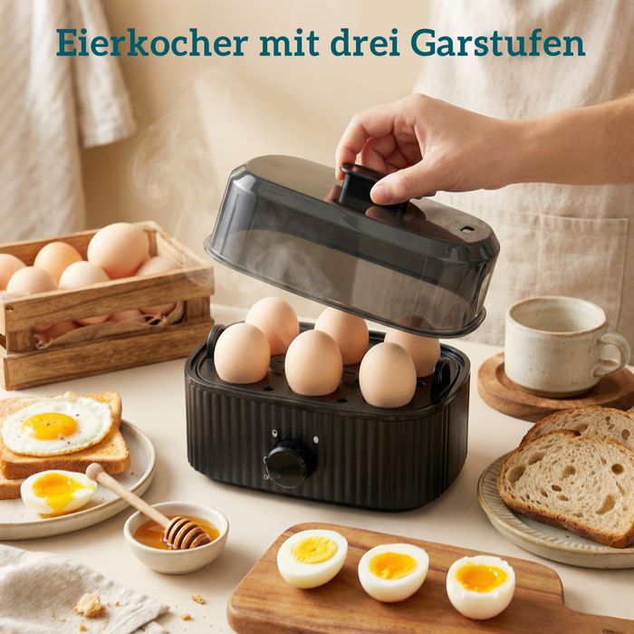 - 6-Eier-Kocher mit Kontrollleuchte: Kocht bis zu 6 Eier auf Edelstahl-Heizplatte. Enthalten: Messbecher, abnehmbarer Deckel, Dampfgestell. Einfach zu reinigen—schnell, effizient, unkompliziert.