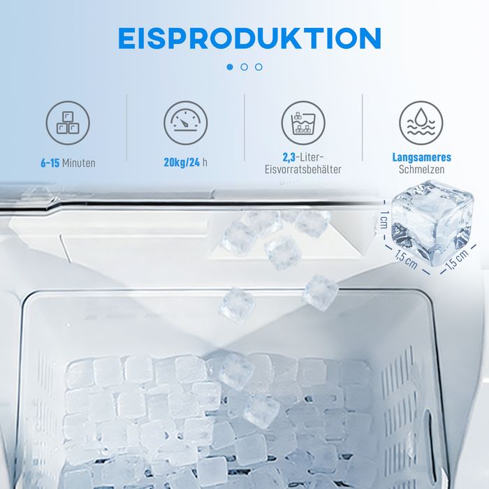- Eisproduktion: 20 kg/Tag, 24 Eiswürfel pro Mal