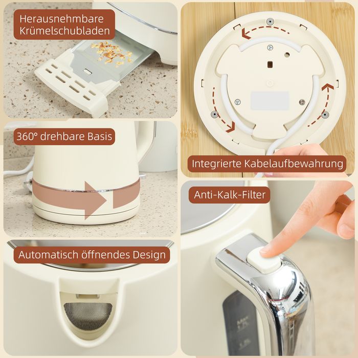 - ✔ Wasserkocher und Toaster sind mit automatischer Abschaltung ausgestattet und bestehen aus BPA-freien Materialien für Ihre Sicherheit