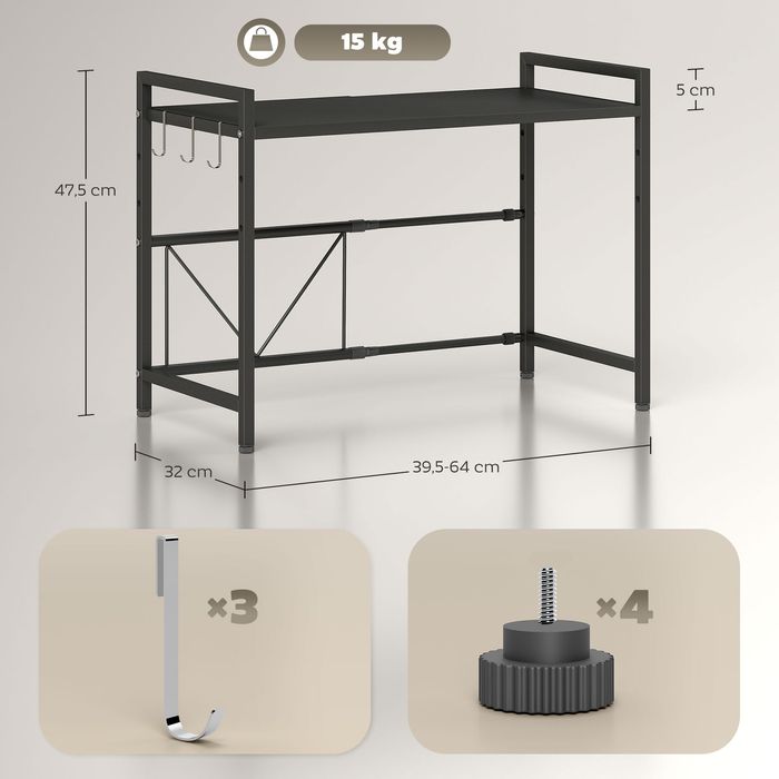Modernisieren Sie Ihre Küche mit dem HOMCOM Mikrowellenregal, einer stilvollen Aufbewahrungslösung, die Ordnung und Übersichtlichkeit schafft. Mit einem unteren Freiraum von 40 cm bietet es Platz für die meisten Geräte, während drei Haken Ihre Utensilien stets zur Hand halten. Von 39,5 bis 64 cm erweiterbar, verwandelt sich das Regal in eine schicke Kaffeestation, die sich perfekt in jedes Ambiente einfügt.