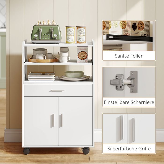 Mikrowellenschrank, Regal, Doppeltürschrank, Schublade, Rollen, Weiss
