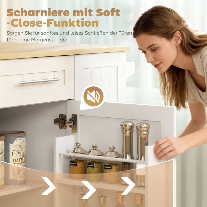 - Ruhe und Komfort in jedem Detail: Die Schranktüren des Küchenschranks mit Arbeitsplatte schliessen dank Soft-Close-Scharnieren leise und sanft, was Geräusche und Einklemmen minimiert und die Sicherheit in Ihrer Küche erhöht