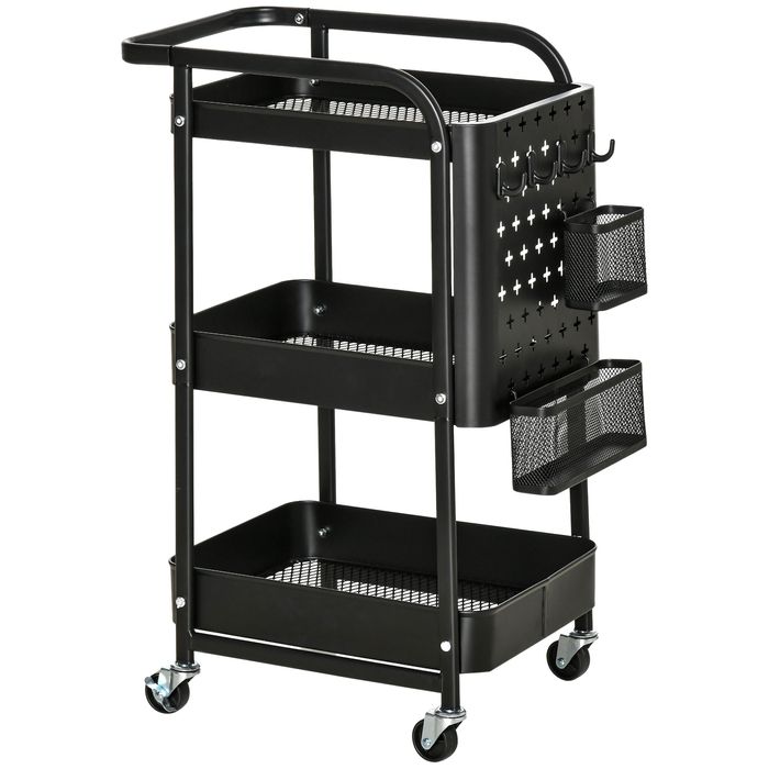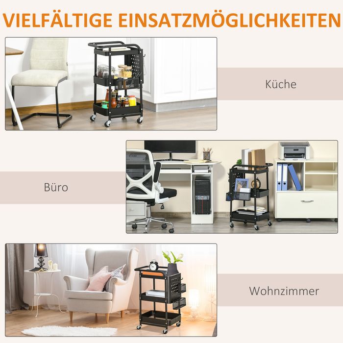 Küchentrolley mit Lochtafel, Handtuchhalter, Aufbewahrungskörbe, Schwarz