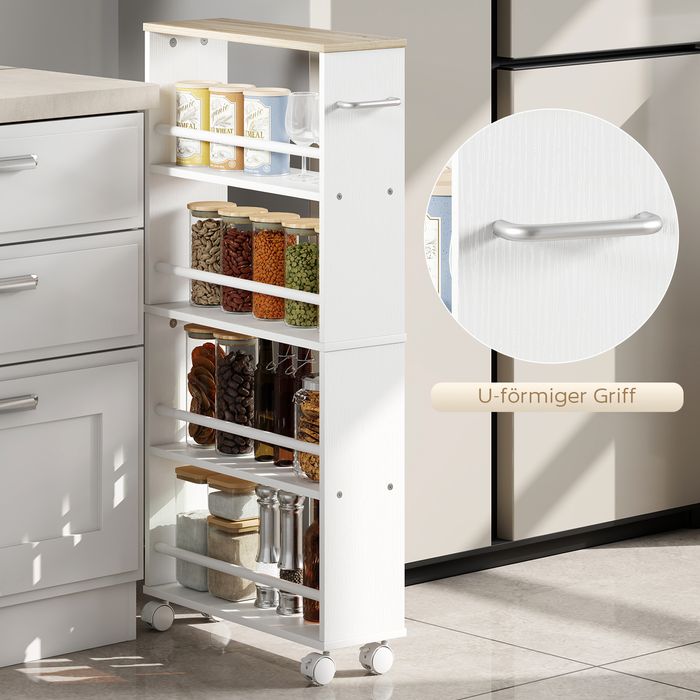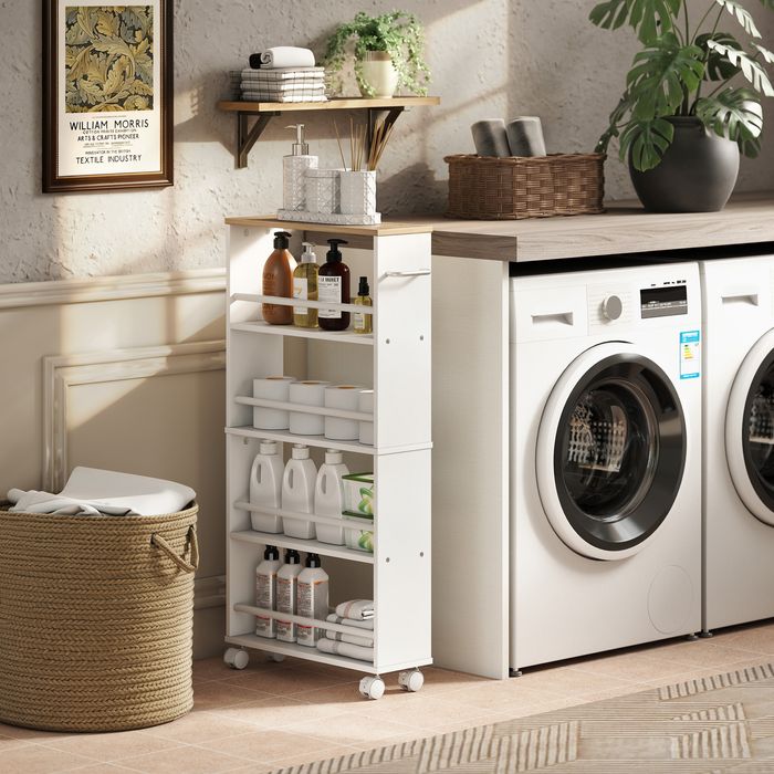 - Platzsparendes Design: Besonders schmal gebaut, passt dieser Aufbewahrungswagen mühelos neben Ihren Kühlschrank oder als praktischer Eckregal in Ihrem Waschkeller. Nutzen Sie kleine Räume effizient und schaffen Sie zusätzlichen Stauraum