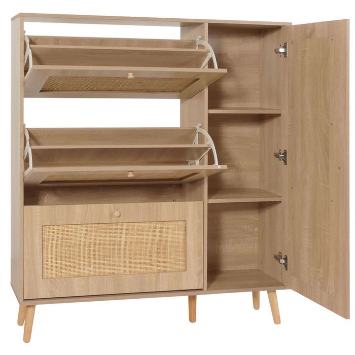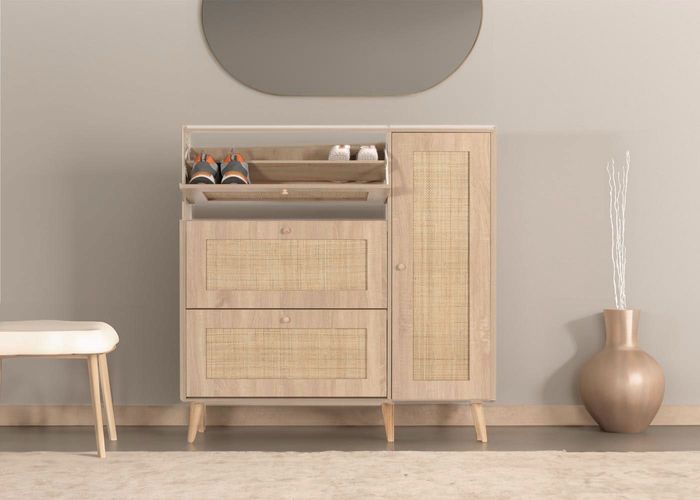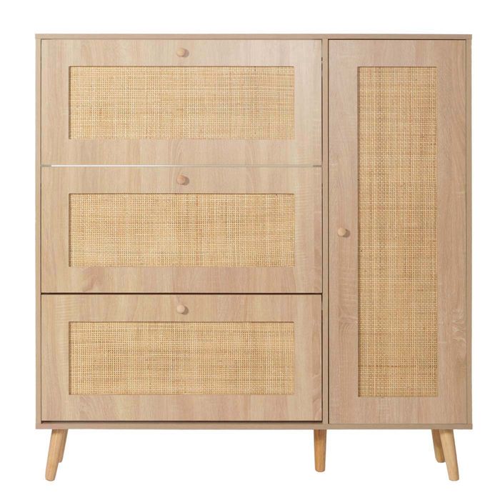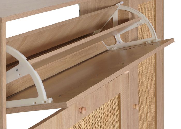 - Dieser Schuhkipper mit handgefertigtem natürlichen Kubu Rattan glänzt durch sein schlichtes, elegantes Design. Mit diesem praktischen Schuhschrank mit drei Kippfächern für 18–36 Paar Schuhe organisieren Sie Ihre Schuhe stilvoll und platzsparend.