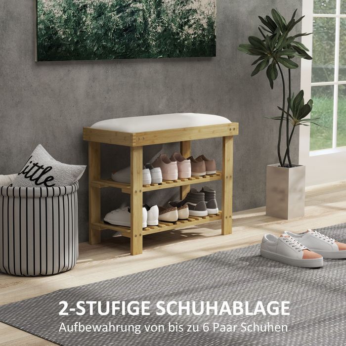 Schuhbank mit Sitzfläche, Bambus Sitzbank mit Stauraum, 2 offene Fächer, Sitzbank 60 x 29 x 49 cm Cremeweiss