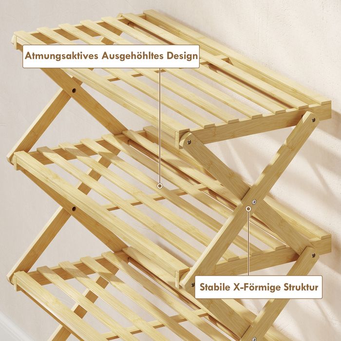 - Natürlicher Bambusbau: Hergestellt aus robustem Bambus mit einem klaren Lackfinish, widersteht dieses Schuhregal Feuchtigkeit und täglicher Abnutzung und präsentiert sich in einem sauberen, natürlichen Design. Es trägt problemlos schweres Schuhwerk mit einer Belastbarkeit von bis zu 40 kg.