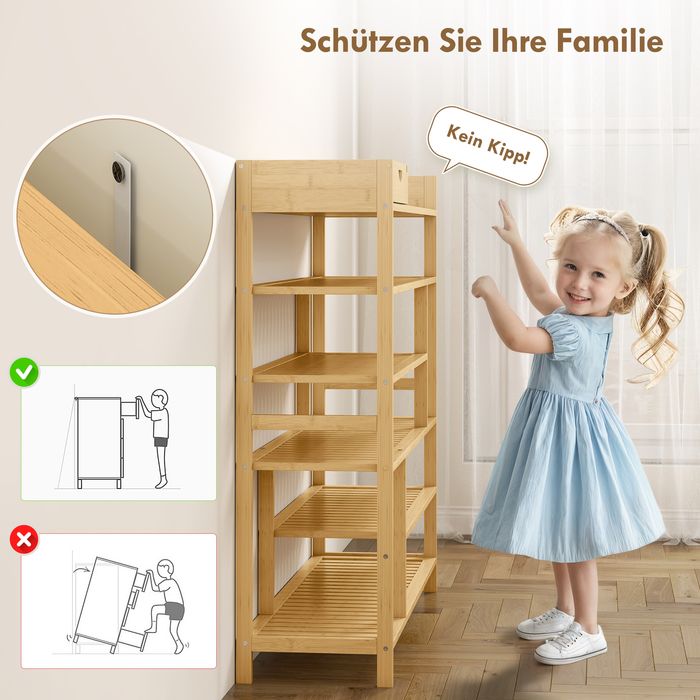 - Sicher und stabil: Aus robustem Bambus gefertigt, zeichnet sich dieses Schuhregal durch seine Stabilität und die leicht zu reinigenden lackierten Oberflächen aus. Ein Anti-Kipp-Kit und rutschfeste Pads sorgen für zusätzliche Sicherheit und Stabilität im täglichen Gebrauch.