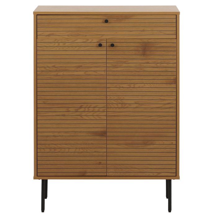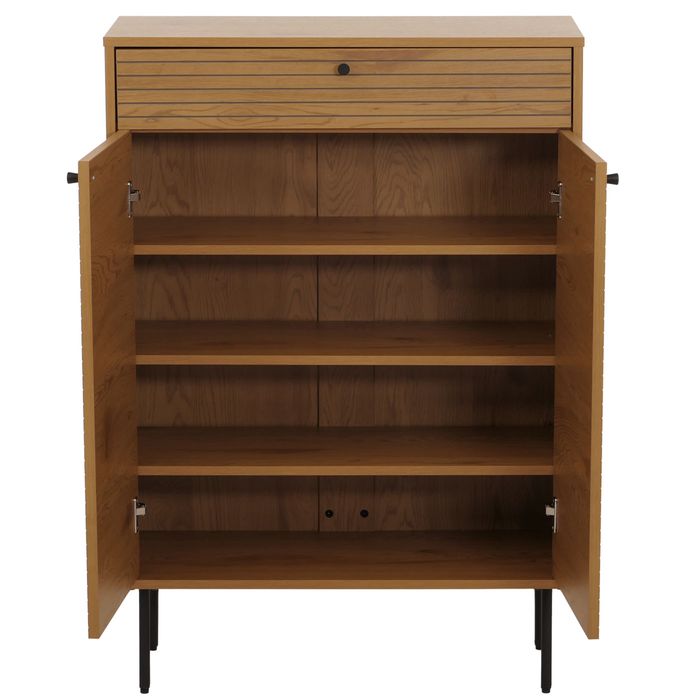 Der Schuhschrank N78 bietet eine stilvolle und praktische Lösung für Ihre Schuhaufbewahrung. Mit grosszügigem Stauraum in vier Ablagefächern und variabel montierbaren Regalböden passt sich der Innenraum flexibel an Ihre Bedürfnisse an. Zusätzlich sorgt eine Schublade für die übersichtliche Unterbringung von Accessoires wie Schlüsseln oder Pflegemitteln. Die Türoberfläche im skandinavischen Stil mit dekorativem Griff verleiht dem Schrank eine zeitlose Eleganz. Dank höhenverstellbarer Fussbodenschoner steht der Schrank auch auf unebenen Böden sicher und schont empfindliche Untergründe.