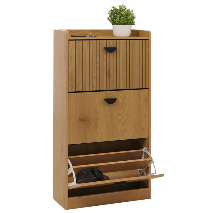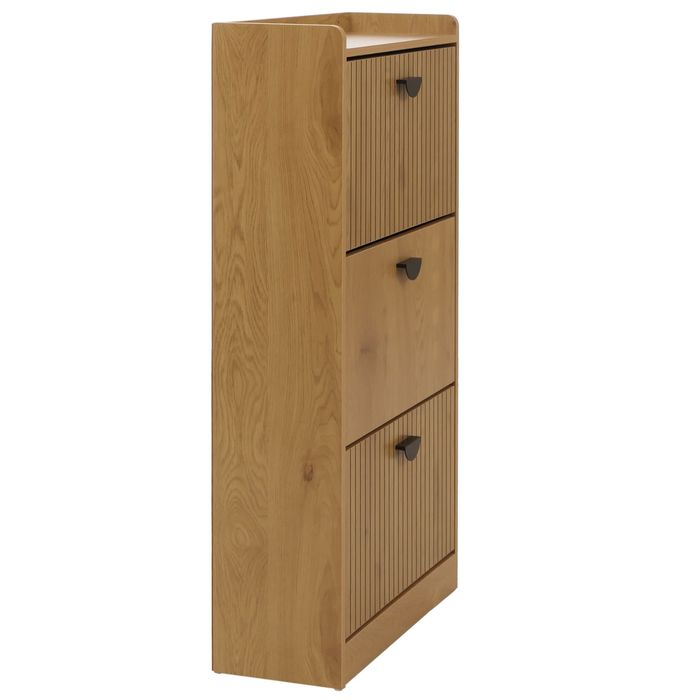 Dieser stilvolle Schuhschrank überzeugt durch seine moderne Optik und hohe Funktionalität. Die drei Klappfächer mit Fronten im trendigen Lamellen-Design verleihen dem Schuhkipper eine elegante Struktur, die ihn zu einem echten Blickfang im Flur oder Eingangsbereich macht. Hinter den Klappen verbirgt sich grosszügiger Stauraum, der Platz für ca. 18 Paar Schuhe bietet und somit Ordnung ins Schuhchaos bringt. Dank der zusätzlichen Ablagefläche auf der Oberseite eignet sich der Schrank auch ideal, um Schlüssel, Taschen oder dekorative Accessoires griffbereit abzulegen. Die Oberfläche ist mit einer robusten Melamin-Beschichtung versehen, die nicht nur besonders kratzfest, sondern auch wasserabweisend ist - perfekt geeignet für den täglichen Gebrauch und langlebige Qualität. Jedes Fach ist stabil konstruiert und erlaubt eine sichere Aufbewahrung Ihrer Schuhe, während die obere Ablage zusätzlich mit praktischer Belastbarkeit überzeugt. Ob als platzsparendes Schuhregal mit 3 Klappen, kompakter Schuhkipper oder moderner Stauraumschrank, dieses Möbelstück passt sich flexibel an Ihre Bedürfnisse an. Besonders harmonisch lässt es sich mit weiteren Elementen der Möbelserie O39 kombinieren, wodurch ein einheitliches und stilvolles Einrichtungskonzept entsteht. Mit seiner Holzoptik und denGriffen integriert sich der Schrank sowohl in moderne als auch in skandinavische oder industrielle Wohnstile. Die Lieferung erfolgt ohne Dekoration, sodass Sie den Schuhschrank individuell nach Ihrem Geschmack gestalten können. Ein funktionales und zugleich dekoratives Möbelstück, das Ihren Eingangsbereich aufgeräumt und stilvoll wirken lässt.