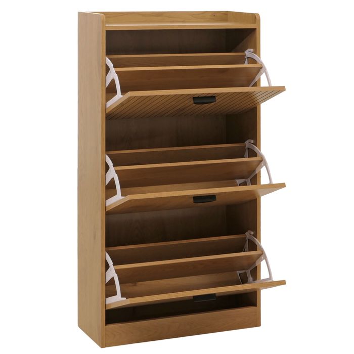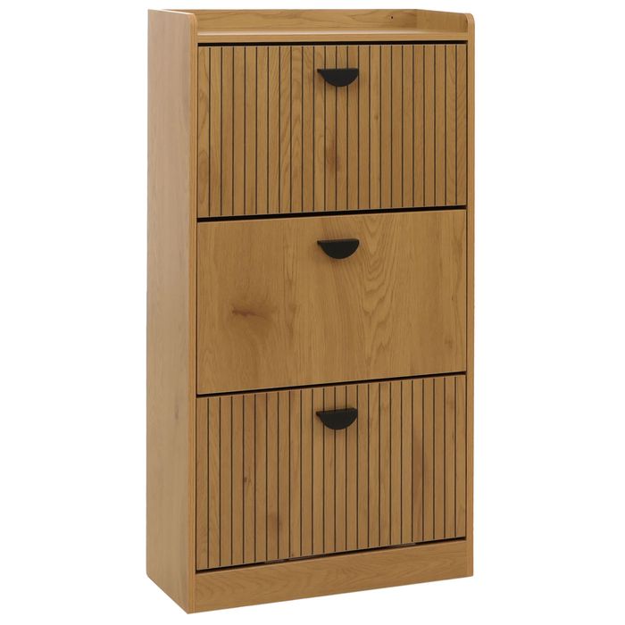 Schuhschrank HWC-O39, 3 Klappen MDF Melamin Metall 117x60x24cm – natur