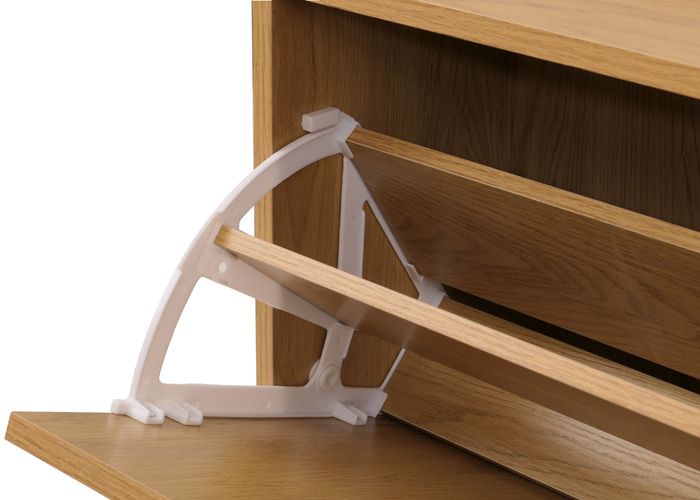 - Der Schuhschrank im modernen Lamellen-Design bietet Stauraum in drei praktischen Klappfächern und Platz für ca. 18 Paar Schuhe. Die robuste Melamin-Beschichtung macht die Oberfläche kratzfest und wasserabweisend - ideal für den täglichen Gebrauch.