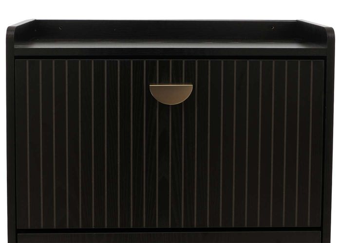Dieser stilvolle Schuhschrank überzeugt durch seine moderne Optik und hohe Funktionalität. Die vier Klappfächer mit Fronten im trendigen Lamellen-Design verleihen dem Schuhkipper eine elegante Struktur, die ihn zu einem echten Blickfang im Flur oder Eingangsbereich macht. Hinter den Klappen verbirgt sich grosszügiger Stauraum, der Platz für ca. 16 Paar Schuhe bietet und somit Ordnung ins Schuhchaos bringt. Dank der zusätzlichen Ablagefläche auf der Oberseite eignet sich der Schrank auch ideal, um Schlüssel, Taschen oder dekorative Accessoires griffbereit abzulegen. Die Oberfläche ist mit einer robusten Melamin-Beschichtung versehen, die nicht nur besonders kratzfest, sondern auch wasserabweisend ist - perfekt geeignet für den täglichen Gebrauch und langlebige Qualität. Jedes Fach ist stabil konstruiert und erlaubt eine sichere Aufbewahrung Ihrer Schuhe, während die obere Ablage zusätzlich mit praktischer Belastbarkeit überzeugt. Ob als platzsparendes Schuhregal mit 4 Klappen, kompakter Schuhkipper oder moderner Stauraumschrank, dieses Möbelstück passt sich flexibel an Ihre Bedürfnisse an. Besonders harmonisch lässt es sich mit weiteren Elementen der Möbelserie O39 kombinieren, wodurch ein einheitliches und stilvolles Einrichtungskonzept entsteht. Mit seiner Holzoptik und den schwarzen Details integriert sich der Schrank sowohl in moderne als auch in skandinavische oder industrielle Wohnstile. Die Lieferung erfolgt ohne Dekoration, sodass Sie den Schuhschrank individuell nach Ihrem Geschmack gestalten können. Ein funktionales und zugleich dekoratives Möbelstück, das Ihren Eingangsbereich aufgeräumt und stilvoll wirken lässt.