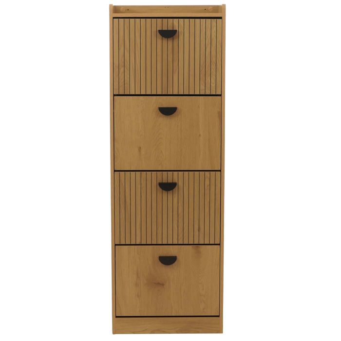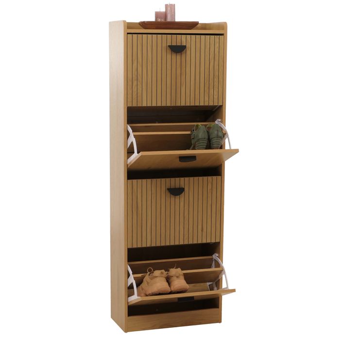 Schuhschrank HWC-O39, 4 Klappen MDF Melamin Metall 148x50x24cm – natur