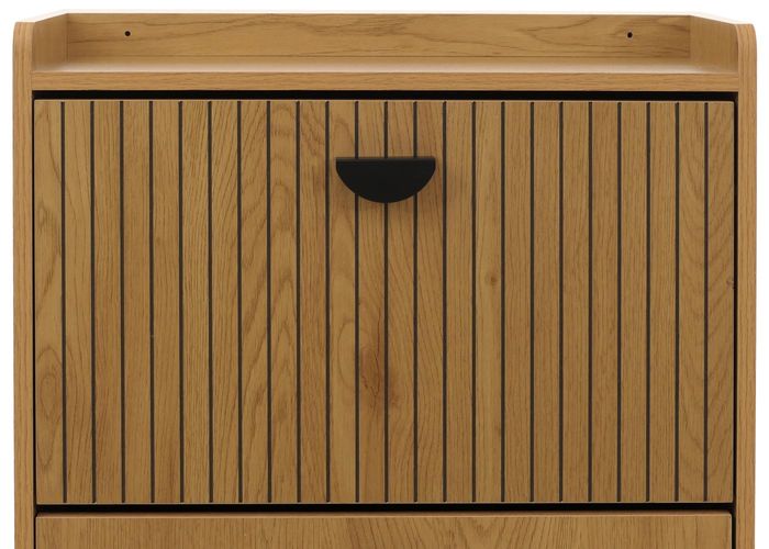 Dieser stilvolle Schuhschrank überzeugt durch seine moderne Optik und hohe Funktionalität. Die vier Klappfächer mit Fronten im trendigen Lamellen-Design verleihen dem Schuhkipper eine elegante Struktur, die ihn zu einem echten Blickfang im Flur oder Eingangsbereich macht. Hinter den Klappen verbirgt sich grosszügiger Stauraum, der Platz für ca. 16 Paar Schuhe bietet und somit Ordnung ins Schuhchaos bringt. Dank der zusätzlichen Ablagefläche auf der Oberseite eignet sich der Schrank auch ideal, um Schlüssel, Taschen oder dekorative Accessoires griffbereit abzulegen. Die Oberfläche ist mit einer robusten Melamin-Beschichtung versehen, die nicht nur besonders kratzfest, sondern auch wasserabweisend ist - perfekt geeignet für den täglichen Gebrauch und langlebige Qualität. Jedes Fach ist stabil konstruiert und erlaubt eine sichere Aufbewahrung Ihrer Schuhe, während die obere Ablage zusätzlich mit praktischer Belastbarkeit überzeugt. Ob als platzsparendes Schuhregal mit 4 Klappen, kompakter Schuhkipper oder moderner Stauraumschrank, dieses Möbelstück passt sich flexibel an Ihre Bedürfnisse an. Besonders harmonisch lässt es sich mit weiteren Elementen der Möbelserie O39 kombinieren, wodurch ein einheitliches und stilvolles Einrichtungskonzept entsteht. Mit seiner Holzoptik und den schwarzen Details integriert sich der Schrank sowohl in moderne als auch in skandinavische oder industrielle Wohnstile. Die Lieferung erfolgt ohne Dekoration, sodass Sie den Schuhschrank individuell nach Ihrem Geschmack gestalten können. Ein funktionales und zugleich dekoratives Möbelstück, das Ihren Eingangsbereich aufgeräumt und stilvoll wirken lässt.