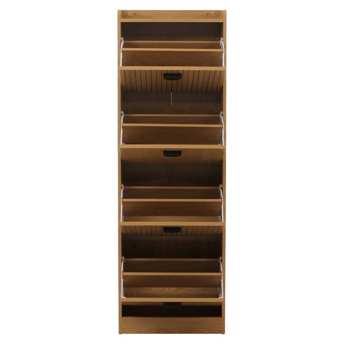 - Der Schuhschrank im modernen Lamellen-Design bietet Stauraum in vier praktischen Klappfächern und Platz für ca. 16 Paar Schuhe. Die robuste Melamin-Beschichtung macht die Oberfläche kratzfest und wasserabweisend - ideal für den täglichen Gebrauch.