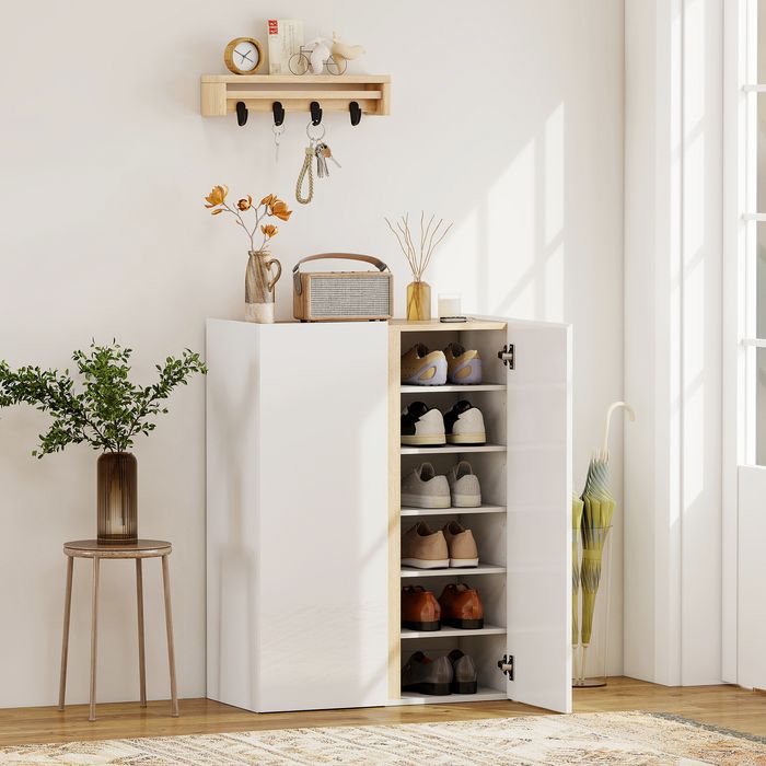 - Moderne Ästhetik: Diese Schuhaufbewahrung mit glänzenden weissen Türen und einer Oberfläche in warmer Holzoptik vereint klare Linien und sanfte Farbtöne. Er schafft einen minimalistischen Stil, der jeden Flur oder Eingangsbereich bereichert