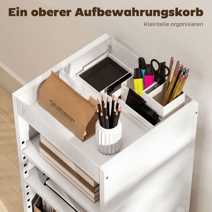 - Anpassbarer Stauraum mit Etagen: Schaffen Sie Ordnung mit zwei verstellbaren Regalböden, die für Bücher oder Küchenutensilien geeignet sind. Der obere Korb des Rollwagens bietet zusätzlichen Platz für kleinere Alltagsgegenstände.