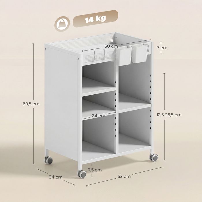 - Robuste Metallkonstruktion: 0,6 mm starker Metallrahmen des Rollwagens mit langlebiger Pulverbeschichtung. Trägt 5 kg oben, 3 kg pro Regalboden. Stabil und ideal für tägliche Aufbewahrung.