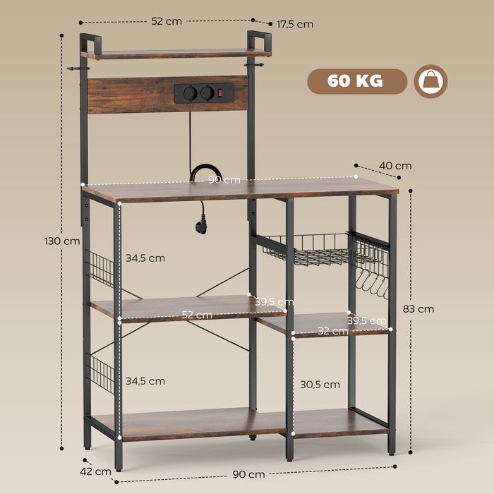 Küchenregal, 2 Steckdosen, Haken, 5 Ablagen, Korb, Stahl, 90x42x130cm