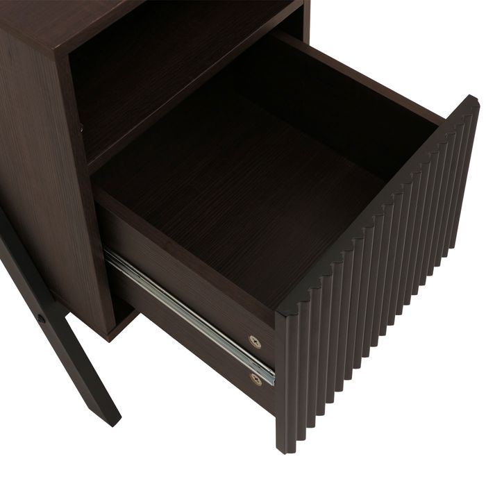 Für zusätzlichen Komfort sorgt das integrierte Kabelloch auf der Rückseite, das ein sauberes und unkompliziertes Laden von Smartphones, Tablets oder anderen Geräten ermöglicht. Getragen wird die Kommode von stabilen V-förmigen Metallfüssen, die nicht nur optisch überzeugen, sondern auch für hohe Standfestigkeit sorgen. Fussbodenschoner unter den Beinen schützen empfindliche Böden zuverlässig vor Kratzern und Abnutzung. Dank seiner klaren Formensprache und dem harmonischen Materialmix lässt sich der Nachttisch O40 ideal mit weiteren Möbeln der gleichnamigen Serie kombinieren und fügt sich perfekt in verschiedene Wohnstile ein. Ob als Nachtschrank neben dem Bett, als Beistelltisch im Wohnzimmer oder als kleine Kommode im Flur - dieser Schrank ist vielseitig einsetzbar und bietet immer die perfekte Verbindung aus Stil, Qualität und Funktionalität.