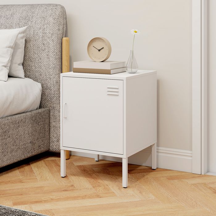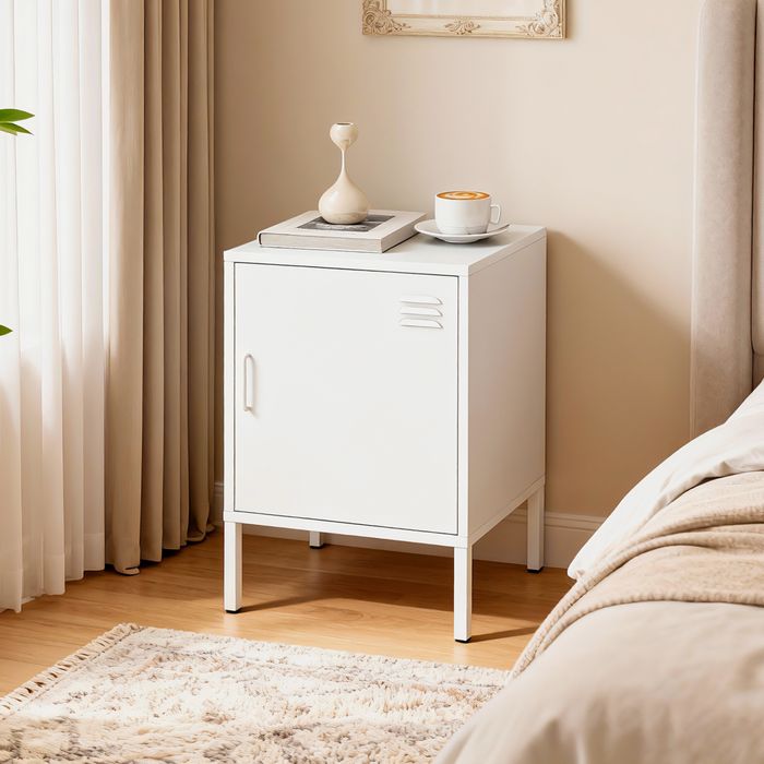 Dieser Nachttisch überzeugt durch sein schlichtes und luftiges Design. Die natürlichen Lüftungsschlitze und die klaren Linien sorgen für ein frisches Ambiente, während das verstellbare Fach Ihre nächtlichen Essentials bereithält. Kompakt und ideal für kleine Schlafzimmer oder helle Wohnbereiche, bietet er unaufdringlichen Charme, ohne Raum zu verbrauchen. Der Stahlrahmen sorgt für solide Stabilität und macht das Nachtkästchen zu einem verlässlichen Begleiter für Ihren Alltag.