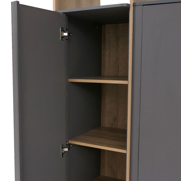 Der Schrank P43 vereint modernes Design mit funktionalem Stauraum und wird so zu einer stilvollen Ergänzung für Ihr Zuhause. Als Garderobenschrank oder Highboard mit drei Türen bietet er eine elegante Lösung, um Kleidung, Accessoires oder Alltagsgegenstände ordentlich und übersichtlich aufzubewahren. Die durchdachte Aufteilung mit praktischen Ablagefächern sorgt dafür, dass alles seinen Platz findet und Ihr Wohnbereich jederzeit aufgeräumt wirkt. Optisch überzeugt der Schrank P43 durch seine harmonische, organische Formgebung. Die sanft abgerundeten Kanten verleihen dem Möbelstück eine moderne, weiche Ausstrahlung und schaffen eine angenehme Wohnatmosphäre. Gleichzeitig setzen die schwarzen Griffe stilvolle Akzente und unterstreichen das zeitgemässe Design. Die Kombination aus klaren Linien, modernen Details und funktionaler Gestaltung macht dieses Highboard zu einem echten Blickfang in Flur, Schlafzimmer oder Wohnbereich.