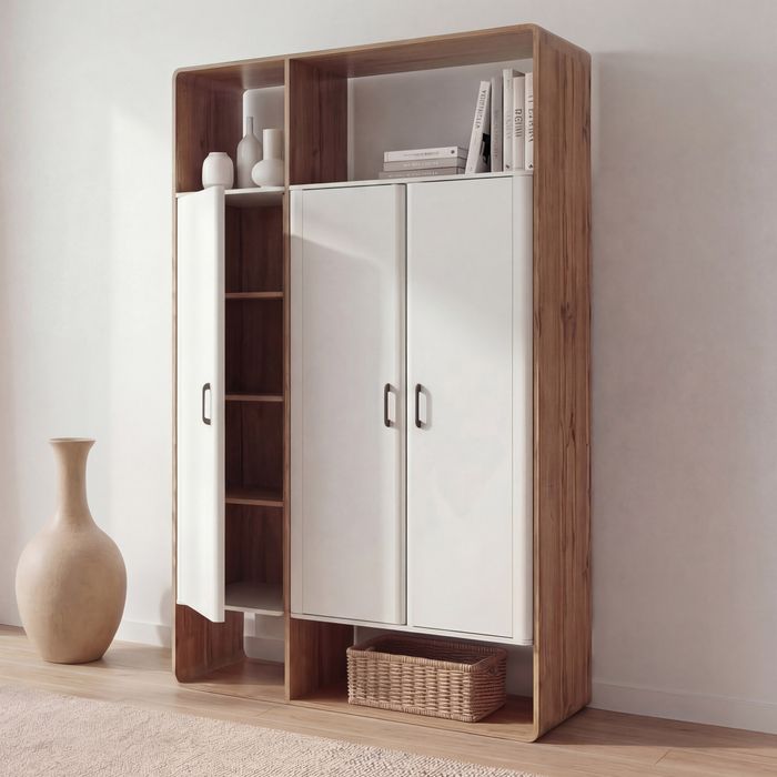 Der Schrank P43 vereint modernes Design mit funktionalem Stauraum und wird so zu einer stilvollen Ergänzung für Ihr Zuhause. Als Garderobenschrank oder Highboard mit drei Türen bietet er eine elegante Lösung, um Kleidung, Accessoires oder Alltagsgegenstände ordentlich und übersichtlich aufzubewahren. Die durchdachte Aufteilung mit praktischen Ablagefächern sorgt dafür, dass alles seinen Platz findet und Ihr Wohnbereich jederzeit aufgeräumt wirkt. Optisch überzeugt der Schrank P43 durch seine harmonische, organische Formgebung. Die sanft abgerundeten Kanten verleihen dem Möbelstück eine moderne, weiche Ausstrahlung und schaffen eine angenehme Wohnatmosphäre. Gleichzeitig setzen die schwarzen Griffe stilvolle Akzente und unterstreichen das zeitgemässe Design. Die Kombination aus klaren Linien, modernen Details und funktionaler Gestaltung macht dieses Highboard zu einem echten Blickfang in Flur, Schlafzimmer oder Wohnbereich.