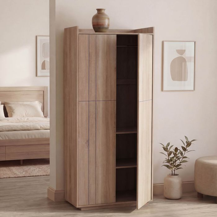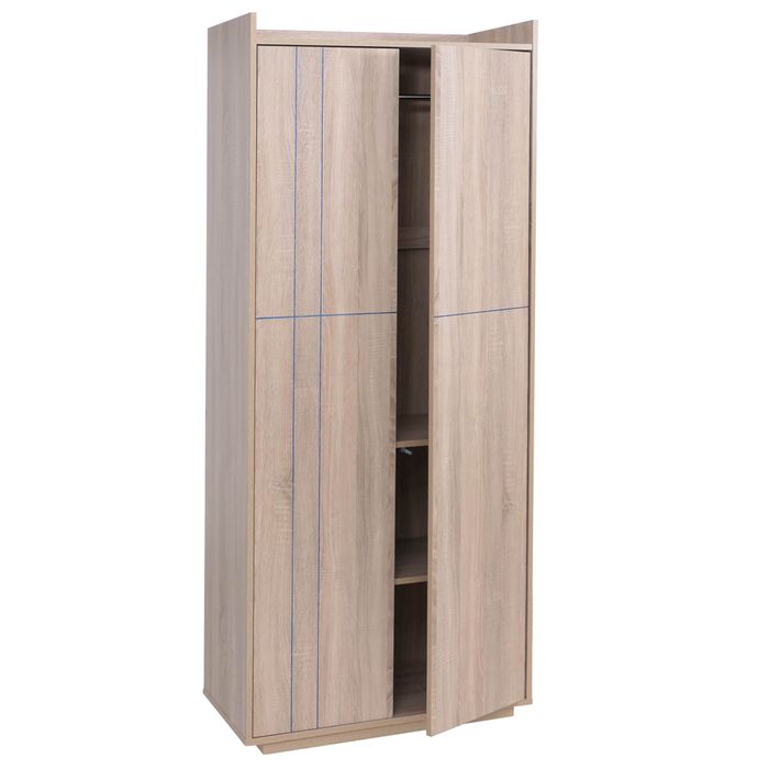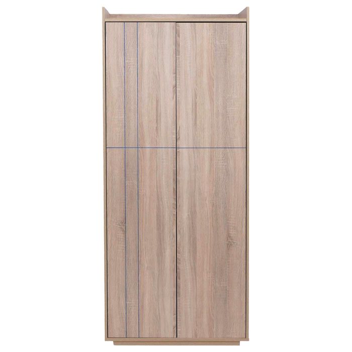 Der Schrank P44 vereint modernes Design mit durchdachter Funktionalität und wird so zum stilvollen Highlight in Schlafzimmer, Flur oder Ankleidezimmer. Mit seinen Massen bietet dieser hochwertige Kleiderschrank viel Stauraum, ohne dabei zu viel Platz einzunehmen. Hinter den zwei eleganten Türen mit komfortabler Push-to-open Funktion verbirgt sich ein clever gestalteter Innenraum mit einer stabilen Kleiderstange sowie drei praktischen Staufächern. Hier finden Kleidung, Jacken, Accessoires oder Taschen übersichtlich ihren Platz, sodass Ordnung ganz leicht gelingt. Ein besonderes Designmerkmal ist das edle blaue Glitzerlinien-Design auf der Front, das dem Garderobenschrank eine moderne und zugleich elegante Ausstrahlung verleiht. In Kombination mit der pflegeleichten Oberfläche in stilvoller Holzoptik entsteht ein harmonisches Gesamtbild, das sich perfekt in verschiedenste Wohnstile einfügt. Die hochwertige MDF-Konstruktion sorgt dabei für Stabilität und eine langlebige Nutzung, sodass Sie lange Freude an diesem Möbelstück haben. Auch praktisch überzeugt der Schrank P44 auf ganzer Linie. Die grosszügige Ablagefläche auf der Oberseite schafft zusätzlichen Platz für Boxen, Dekoration oder Aufbewahrungskörbe. Bodenschonende Filzgleiter schützen Ihren Boden zuverlässig vor Kratzern und ermöglichen gleichzeitig ein einfaches Verschieben des Schranks. Ob als moderner Kleiderschrank im Schlafzimmer, funktionaler Garderobenschrank im Flur oder stilvolle Ergänzung im Gästezimmer – dieses Möbelstück kombiniert grosszügigen Stauraum, hochwertige Verarbeitung und ein aussergewöhnliches Design.