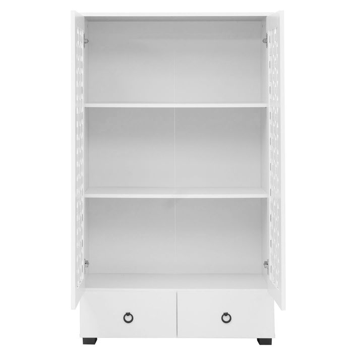 - Dieser elegante Schrank mit 3D-Flecht-Design bietet grosszügigen Stauraum in drei Fächern und zwei Schubladen mit Ring-Griffen. Türen mit Soft-Close-System schliessen sanft, während robuste Materialien Langlebigkeit garantieren.