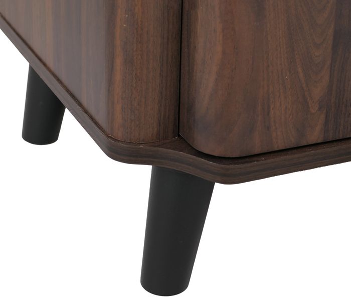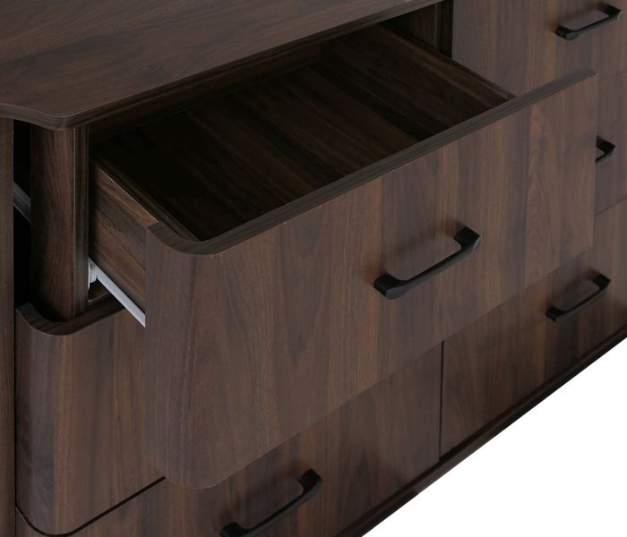 Die organische Form mit sanft abgerundeten Kanten verleiht der Kommode eine besonders harmonische Ausstrahlung und macht sie zu einem echten Blickfang. Die elegante Holzoptik unterstreicht das zeitlose Design und fügt sich mühelos in verschiedenste Einrichtungsstile ein - von modern bis klassisch. Stilvolle, dunkle Griffe setzen dabei einen attraktiven Kontrast und verleihen dem Möbelstück eine moderne Note.