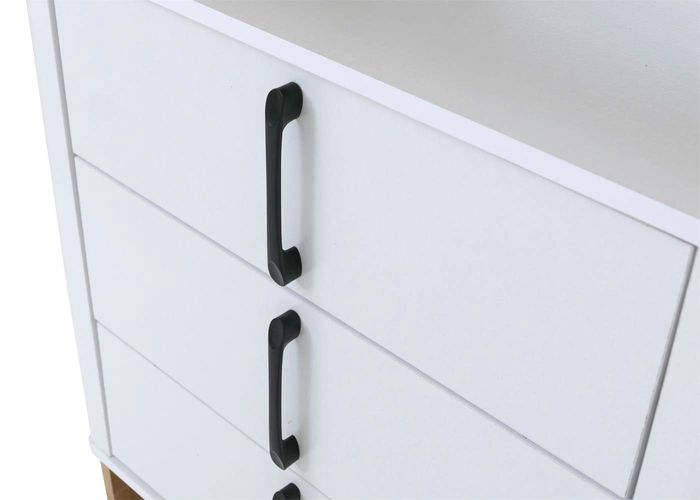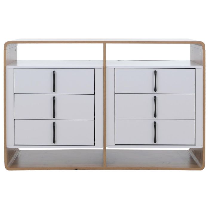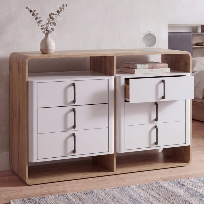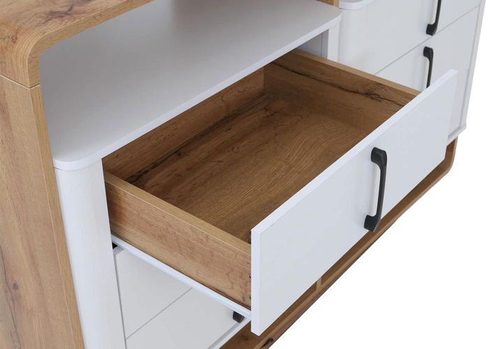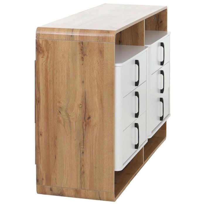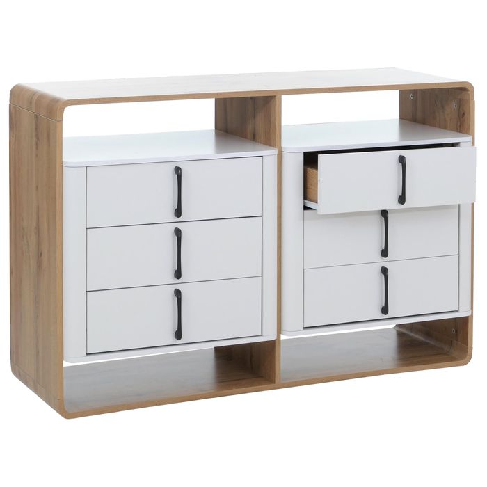 Diese stilvolle Kommode verbindet modernes Design mit funktionalem Stauraum und ist die perfekte Ergänzung für ein ordentliches und harmonisches Zuhause. Mit insgesamt 6 geräumigen Schubladen und praktischen Ablagefächern bietet dieses Sideboard viel Platz, um verschiedenste Gegenstände übersichtlich zu verstauen. Ob Kleidung, Dokumente, Haushaltsutensilien oder Wohnaccessoires, alles findet hier seinen Platz und bleibt jederzeit griffbereit. Die offenen Fächer eignen sich ideal, um dekorative Elemente, Bücher oder Körbe ansprechend zu präsentieren und dem Raum eine persönliche Note zu verleihen. Die stabile Konstruktion sorgt für eine zuverlässige Standfestigkeit und macht die Kommode zu einem langlebigen Möbelstück für den täglichen Gebrauch. Elegante schwarze Griffe setzen einen modernen Akzent und ermöglichen ein bequemes Öffnen der Schubladen. Zusätzlich schützen integrierte Filzschoner empfindliche Böden vor Kratzern und sorgen gleichzeitig für einen sicheren Stand. Dank ihres zeitlosen Designs lässt sich die Kommode vielseitig einsetzen. Sie eignet sich hervorragend als Sideboard im Schlafzimmer, als praktischer Stauraumschrank im Flur, als Ergänzung im Essbereich oder als funktionales Möbelstück im Home-Office. Die klare Linienführung fügt sich mühelos in unterschiedliche Einrichtungsstile ein und sorgt für eine aufgeräumte, moderne Atmosphäre. Besonders harmonisch wirkt die Kommode in Kombination mit weiteren Möbeln der Serie P43, sodass sich ein stimmiges Einrichtungskonzept im gesamten Wohnbereich realisieren lässt. Diese Kommode überzeugt durch ihre gelungene Kombination aus grosszügigem Stauraum, stabiler Verarbeitung und vielseitiger Nutzung, ideal für alle, die Wert auf Ordnung, Stil und Funktionalität legen.