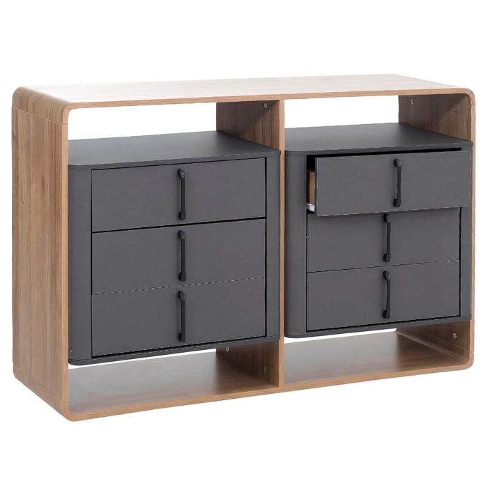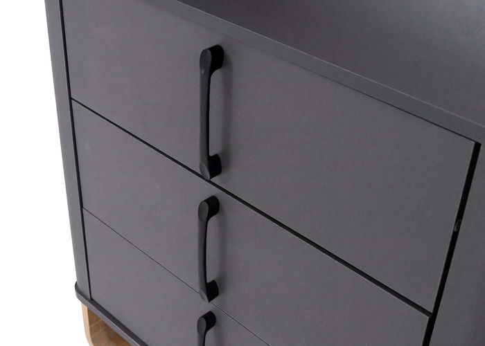Diese stilvolle Kommode verbindet modernes Design mit funktionalem Stauraum und ist die perfekte Ergänzung für ein ordentliches und harmonisches Zuhause. Mit insgesamt 6 geräumigen Schubladen und praktischen Ablagefächern bietet dieses Sideboard viel Platz, um verschiedenste Gegenstände übersichtlich zu verstauen. Ob Kleidung, Dokumente, Haushaltsutensilien oder Wohnaccessoires, alles findet hier seinen Platz und bleibt jederzeit griffbereit. Die offenen Fächer eignen sich ideal, um dekorative Elemente, Bücher oder Körbe ansprechend zu präsentieren und dem Raum eine persönliche Note zu verleihen. Die stabile Konstruktion sorgt für eine zuverlässige Standfestigkeit und macht die Kommode zu einem langlebigen Möbelstück für den täglichen Gebrauch. Elegante schwarze Griffe setzen einen modernen Akzent und ermöglichen ein bequemes Öffnen der Schubladen. Zusätzlich schützen integrierte Filzschoner empfindliche Böden vor Kratzern und sorgen gleichzeitig für einen sicheren Stand. Dank ihres zeitlosen Designs lässt sich die Kommode vielseitig einsetzen. Sie eignet sich hervorragend als Sideboard im Schlafzimmer, als praktischer Stauraumschrank im Flur, als Ergänzung im Essbereich oder als funktionales Möbelstück im Home-Office. Die klare Linienführung fügt sich mühelos in unterschiedliche Einrichtungsstile ein und sorgt für eine aufgeräumte, moderne Atmosphäre. Besonders harmonisch wirkt die Kommode in Kombination mit weiteren Möbeln der Serie P43, sodass sich ein stimmiges Einrichtungskonzept im gesamten Wohnbereich realisieren lässt. Diese Kommode überzeugt durch ihre gelungene Kombination aus grosszügigem Stauraum, stabiler Verarbeitung und vielseitiger Nutzung, ideal für alle, die Wert auf Ordnung, Stil und Funktionalität legen.