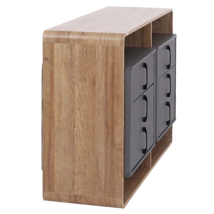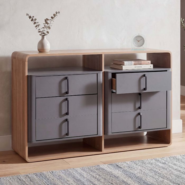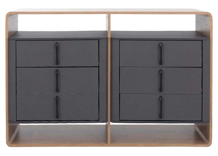 - Sie verfügt über sechs geräumige Schubladen für Kleidung, Accessoires oder Dokumente sowie offene Ablageflächen, auf denen Dekorationen, Bücher oder häufig genutzte Gegenstände griffbereit platziert werden können.