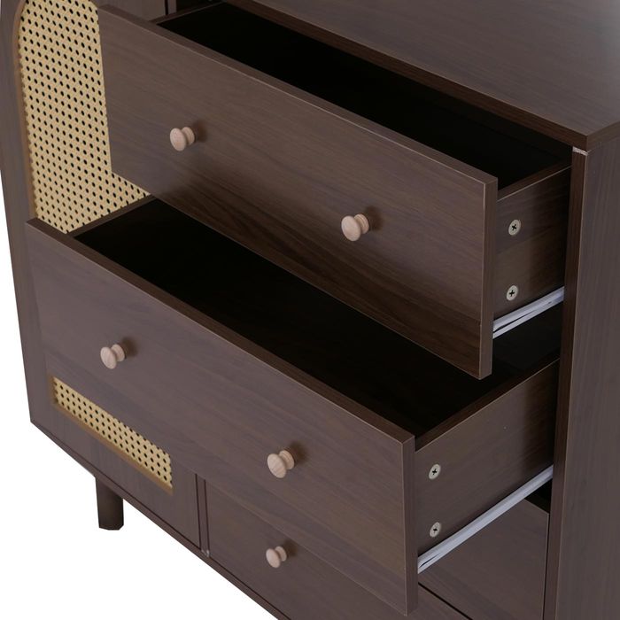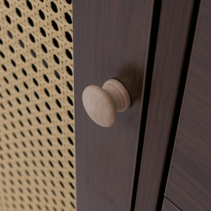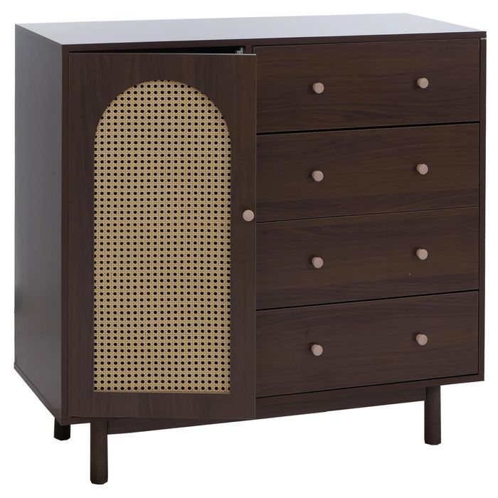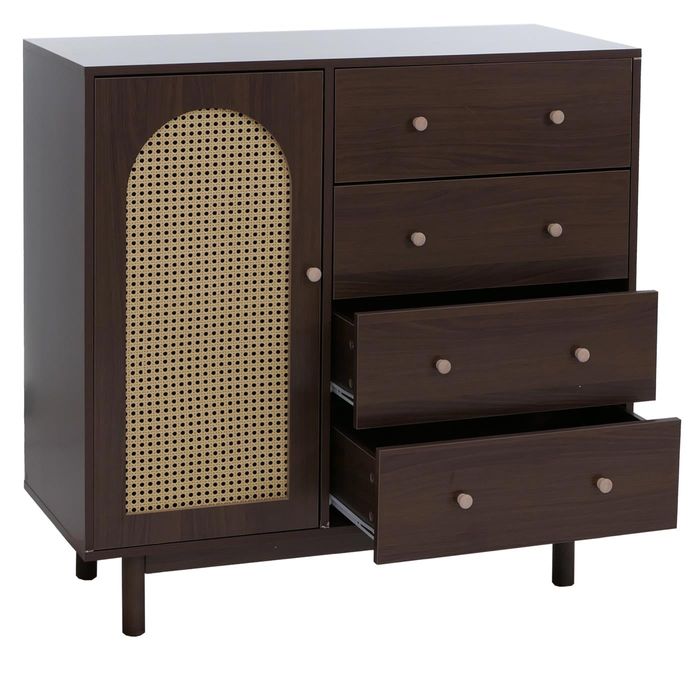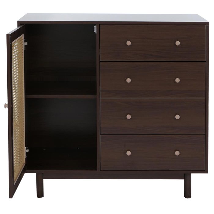 - Ein besonderes Highlight ist die Türfront mit dekorativem Poly-Rattan-Einsatz, die eine warme, natürliche Ausstrahlung verleiht. Vier geräumige Schubladen bieten viel Platz für Accessoires oder Haushaltsutensilien und sorgen für Ordnung mit System.