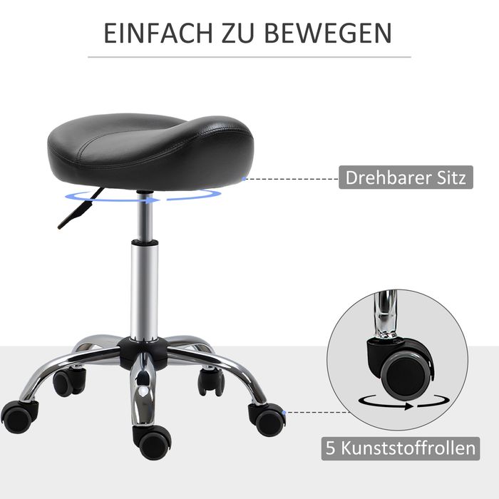 - Funktionales, modernes Design: Ausgestattet mit einem weich gepolsterten Sitz und bezogen mit elegantem Kunstleder, bietet dieser Rollhocker außergewöhnlichen Komfort und ist leicht zu reinigen. Der Sattelsitz entlastet zudem Rücken und Wirbelsäule