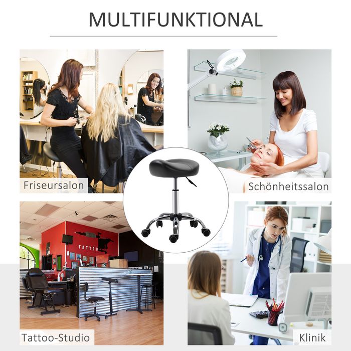 Der elegante Salonhocker von HOMCOM hebt Sie auf die ideale Arbeitshöhe und fördert so ein perfektes Arbeitsumfeld. Mit seinem ergonomischen Design und dem gepolsterten Sitz bietet er langanhaltenden Komfort. Der Bezug aus Kunstleder ist pflegeleicht. Die Sitzhöhe lässt sich individuell anpassen, was besonders praktisch ist. Dank der fünf Rollen lässt sich der Bürohocker frei und flexibel bewegen. Ideal für Ihr Zuhause, Empfangsbereiche, Bars oder Schönheitssalons.